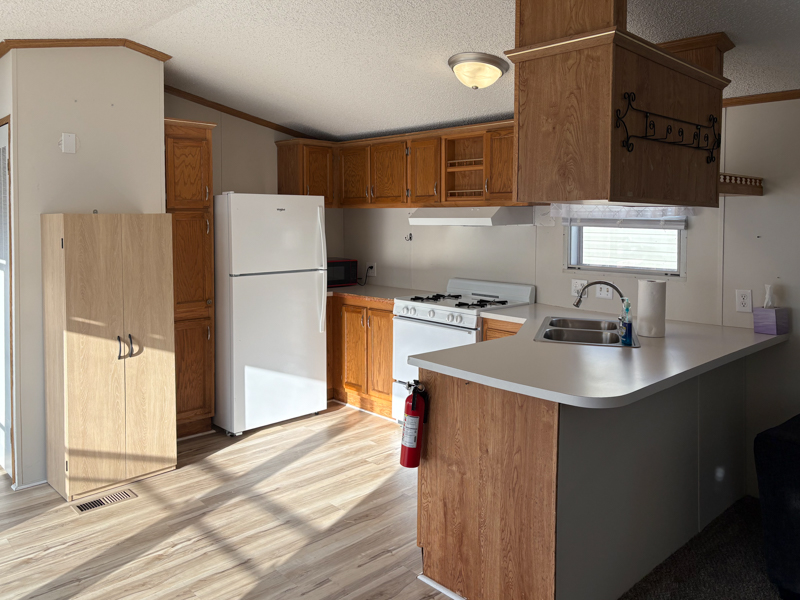 This 1995, Skyline Home has a Spacious Living Room with a Ceiling Fan & a Steel Door out to Wood Steps. The Open Kitchen has a Snack Bar, a Stainless Steel Sink with an Upgraded Faucet, Nice Cabinets with Newer Handles, Built in Pantry Cabinets & an Extra Pantry Cabinet, New Garbage Disposal, New Hood Fan, New Appliances including a Whirlpool Refrigerator, Premier Gas Stove, & Frigidaire Dishwasher, New Laminate Floors, & is open to the Dining Area with new Laminate Floors. The Laundry is the Hall has a New GE Washer & Dryer, New Laminate Floors, & a Door out to Wood Steps. The Master Bedroom has a Double Door Closet & a Ceiling Fan. The Bathroom has a Porcelain Sink, Medicine Cabinet, Linen Cabinets, a Higher Toilet, a Bathtub\Shower, Skylight, & New Laminate Floors. Bedrooms 2 & 3 are a Great Size with a Nice Size Closets. The Main Bathroom has a Porcelain Sink, Medicine Cabinet, Higher Toilet, Bathtub\Shower, Skylight, & New Laminate Floors. This Home also includes a Coat Closet & Coat Rack in the Hall, New Paint, Carpet, Laminate Floors, Light Fixtures, Bathroom Sinks, Faucets, Medicine Cabinets, Grab Bars, Blinds, Vent Covers, Toilets, & Front Door, Wood Steps, Appliances, 2 Window Air Units, & Metal Shed within the last year, also a Newer Roof & a Patio.