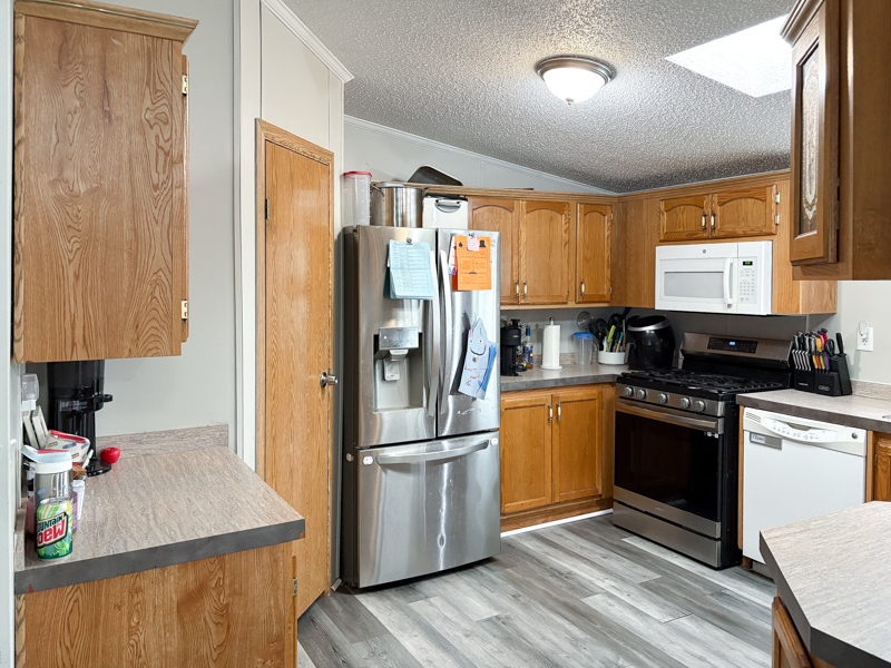 This 1996, Skyline Home has a Spacious Living Room with a Ceiling Fan, Laminate Floors & a Steel Door out to the Deck. The Open Kitchen has Octagon China Cabinets, a Snack Bar, a Walk-in Pantry, a Stainless Steel Sink with an Upgraded Faucet, a Garbage Disposal, LG Stainless Steel French Door Refrigerator with Bottom Freezer, Stainless Steel Samsung Gas Stove, GE Dishwasher, Built in Microwave, Skylight, & Laminate Floors. The Dining Room is Large & has Laminate Floors. The Laundry Room has a GE Washer & Whirlpool Dryer with Cabinets above for Storage, a Coat Closet, Laminate Floors, a Door into the Main Bathroom & a Door into the Hall. The Master Bedroom is Large & the Master Bathroom has Double Porcelain Sinks, a Medicine Cabinet, a Jetted Tub, Stall Shower, Tiled Floors, a Skylight, & a Nice Walk-in Closet. Bedrooms 2 & 3 are a Great Size & have Double Door Closets. The Den (can be used as a 4th bedroom) has Built in Corner Bookcases & a Ledge with Storage underneath. The Main Bathroom has a Porcelain Sink, a Medicine Cabinet, a One Piece Bathtub\Shower, a Skylight, Tiled Floors, & a Door into the Laundry Room. This Home also includes a Linen Closet & Laminate Floors in the Hall, Vinyl Windows, Blinds & Window Treatments, Newer Furnace & Air, New Hot Water Tank 2021, Newer Roof (maybe 9-10 yrs old), Gutters, Brand New Vinyl Skirting, 3+ Car Parking, a Metal Shed, & a LARGE Deck with new Wood Floor & Stain. For More Information or to View This Home Please Contact Michelle Govaere at (810)650-0558!