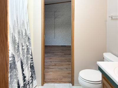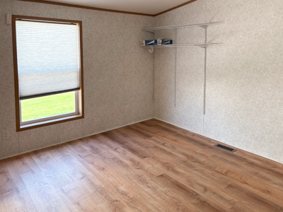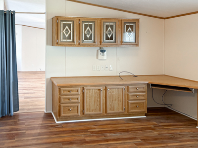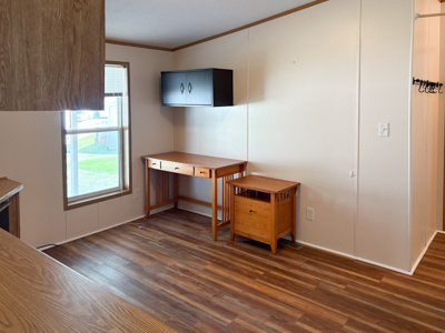 - Den: built-in desk, upper cabinets, laminate floors, curtain separation for privacy.