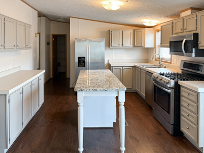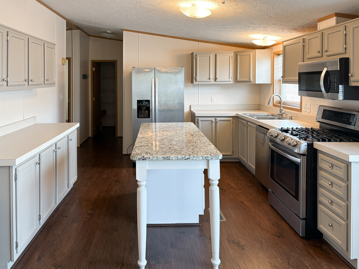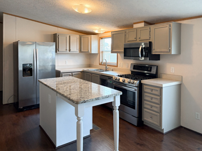 - Island Kitchen: granite island, gray cabinetry, upgraded faucet, large walk-in pantry, laminate flooring, stainless-steel appliances (Amana refrigerator, LG range, LG dishwasher, LG microwave).