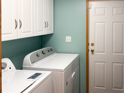 - Laundry: Whirlpool washer & dryer, overhead cabinets, extra shelving and freezer/storage space, steel door access.