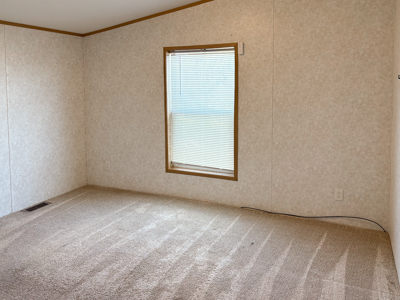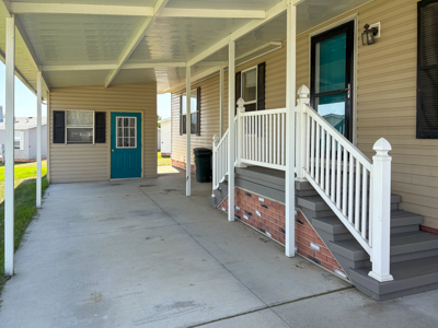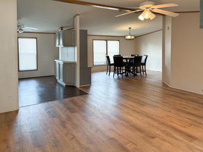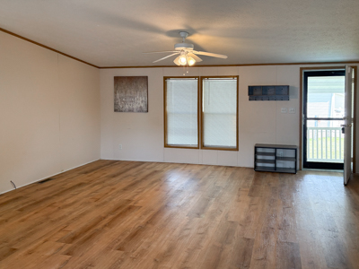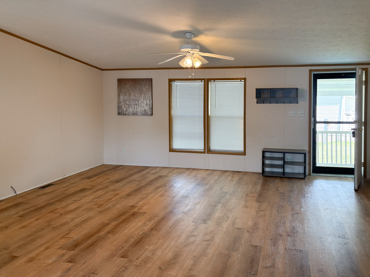 - Living Room: spacious, ceiling fan, laminate floors, steel door & storm door to carport.