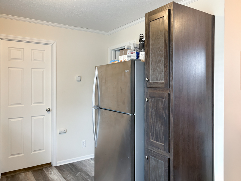 The galley-style kitchen opens to the dining and living areas and includes dark cabinetry, pantry storage, and stainless steel appliances: Frigidaire microwave, Whirlpool dishwasher, refrigerator, and gas stove. The sink features an upgraded faucet.