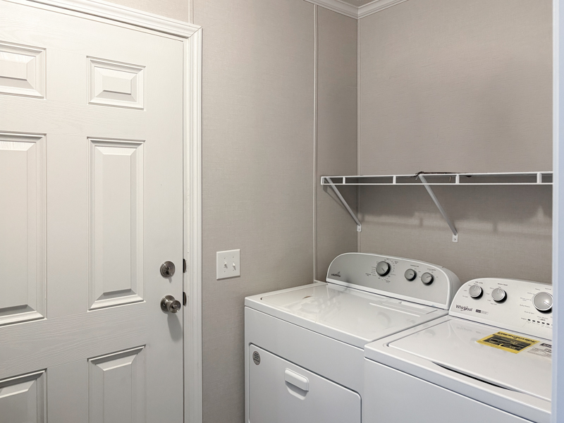 The laundry room includes a Whirlpool washer and dryer, shelving for storage, and a steel door with access to wood steps.