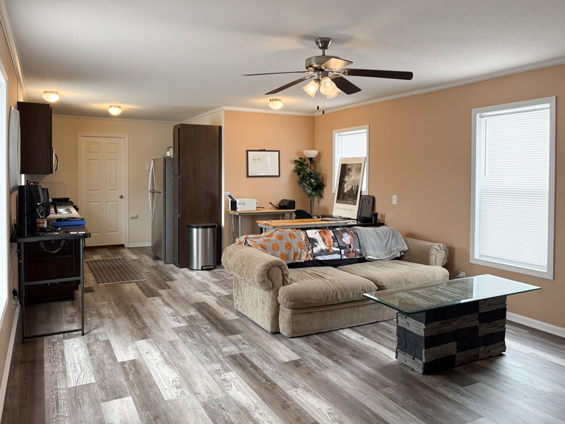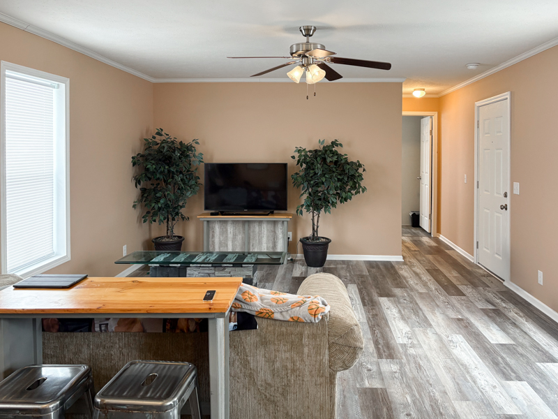 Built in 2020, this Champion home features an open-concept living area with flat ceilings, white six-panel interior doors, crown and base moldings, blinds, and linoleum flooring throughout. The living room includes a ceiling fan and a steel door leading to wood steps with railings.
