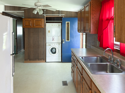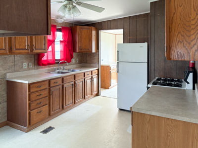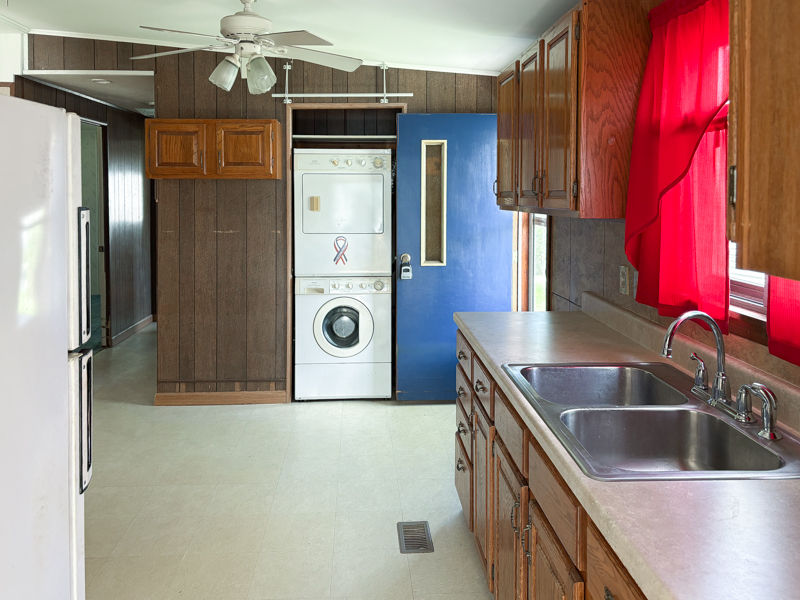 - Open Kitchen: Newer raised-panel cabinets and counters, stainless steel sink with upgraded faucet, Hotpoint gas stove, Tappan refrigerator, washer/dryer area (needs outlet behind), ceiling fan, and back door with awning to yard.