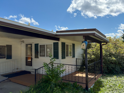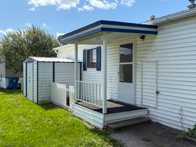 - Wrap-around covered deck (freshly painted), gutters, metal shed with wood floor