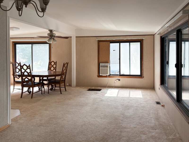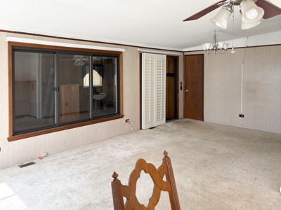 - Spacious Living Room: Door wall to large sunroom with new shutter doors, ceiling fan, built-in TV shelf, picture window & coat closet.