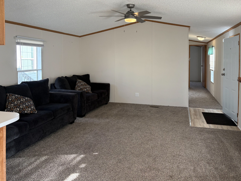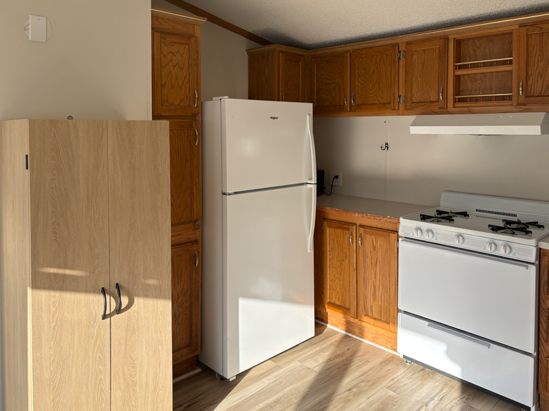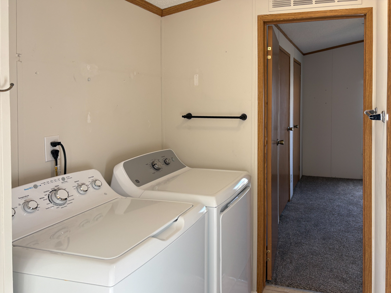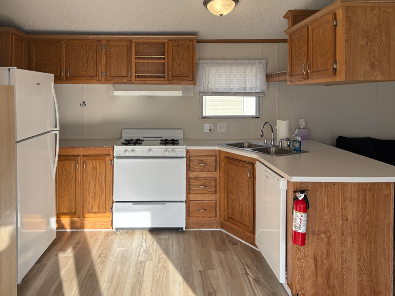 This 1995, Skyline Home has a Spacious Living Room with a Ceiling Fan & a Steel Door out to Wood Steps. The Open Kitchen has a Snack Bar, a Stainless Steel Sink with an Upgraded Faucet, Nice Cabinets with Newer Handles, Built in Pantry Cabinets & an Extra Pantry Cabinet, New Garbage Disposal, New Hood Fan, New Appliances including a Whirlpool Refrigerator, Premier Gas Stove, & Frigidaire Dishwasher, New Laminate Floors, & is open to the Dining Area with new Laminate Floors. The Laundry is the Hall has a New GE Washer & Dryer, New Laminate Floors, & a Door out to Wood Steps. The Master Bedroom has a Double Door Closet & a Ceiling Fan. The Bathroom has a Porcelain Sink, Medicine Cabinet, Linen Cabinets, a Higher Toilet, a Bathtub\Shower, Skylight, & New Laminate Floors. Bedrooms 2 & 3 are a Great Size with a Nice Size Closets. The Main Bathroom has a Porcelain Sink, Medicine Cabinet, Higher Toilet, Bathtub\Shower, Skylight, & New Laminate Floors. This Home also includes a Coat Closet & Coat Rack in the Hall, New Paint, Carpet, Laminate Floors, Light Fixtures, Bathroom Sinks, Faucets, Medicine Cabinets, Grab Bars, Blinds, Vent Covers, Toilets, & Front Door, Wood Steps, Appliances, 2 Window Air Units, & Metal Shed within the last year, also a Newer Roof & a Patio.