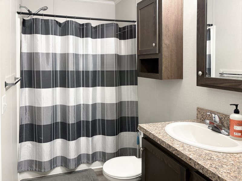 The primary bedroom is generously sized and includes a private bathroom with a one-piece tub/shower, higher vanity with porcelain sink, medicine cabinet, cabinet above the toilet, and shelving for linens with closet space.