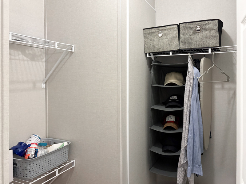 The laundry room includes a Whirlpool washer and dryer, shelving for storage, and a steel door with access to wood steps.