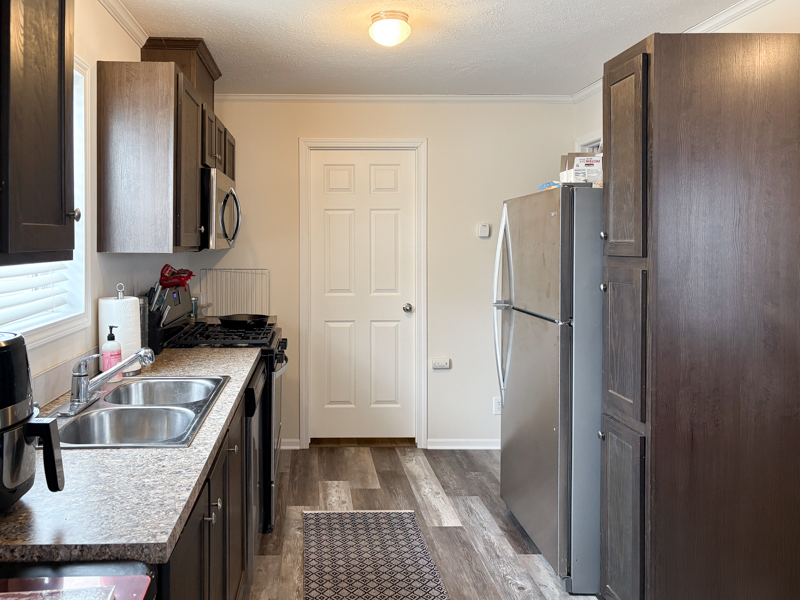 The galley-style kitchen opens to the dining and living areas and includes dark cabinetry, pantry storage, and stainless steel appliances: Frigidaire microwave, Whirlpool dishwasher, refrigerator, and gas stove. The sink features an upgraded faucet.