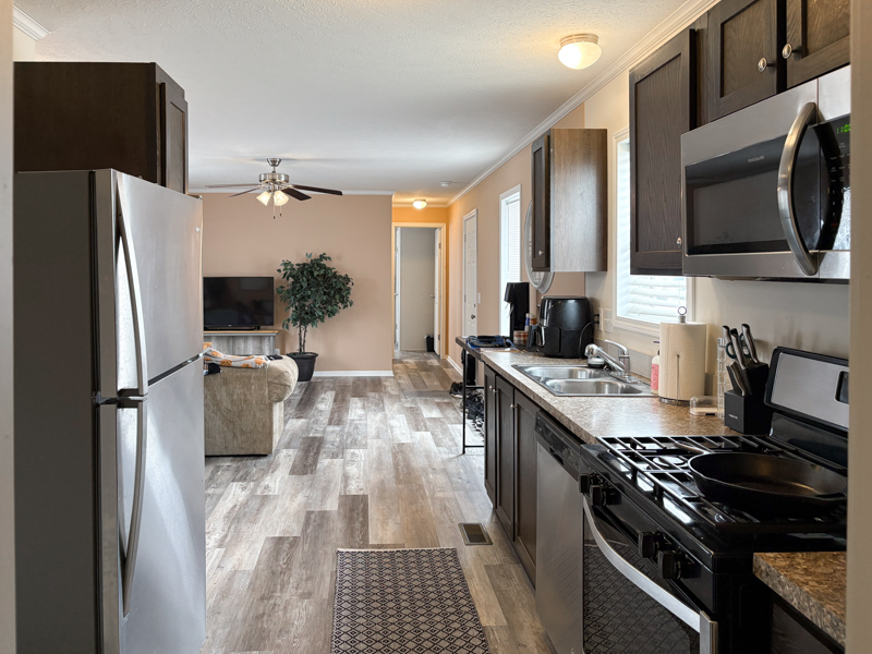 Built in 2020, this Champion home features an open-concept living area with flat ceilings, white six-panel interior doors, crown and base moldings, blinds, and linoleum flooring throughout. The living room includes a ceiling fan and a steel door leading to wood steps with railings.